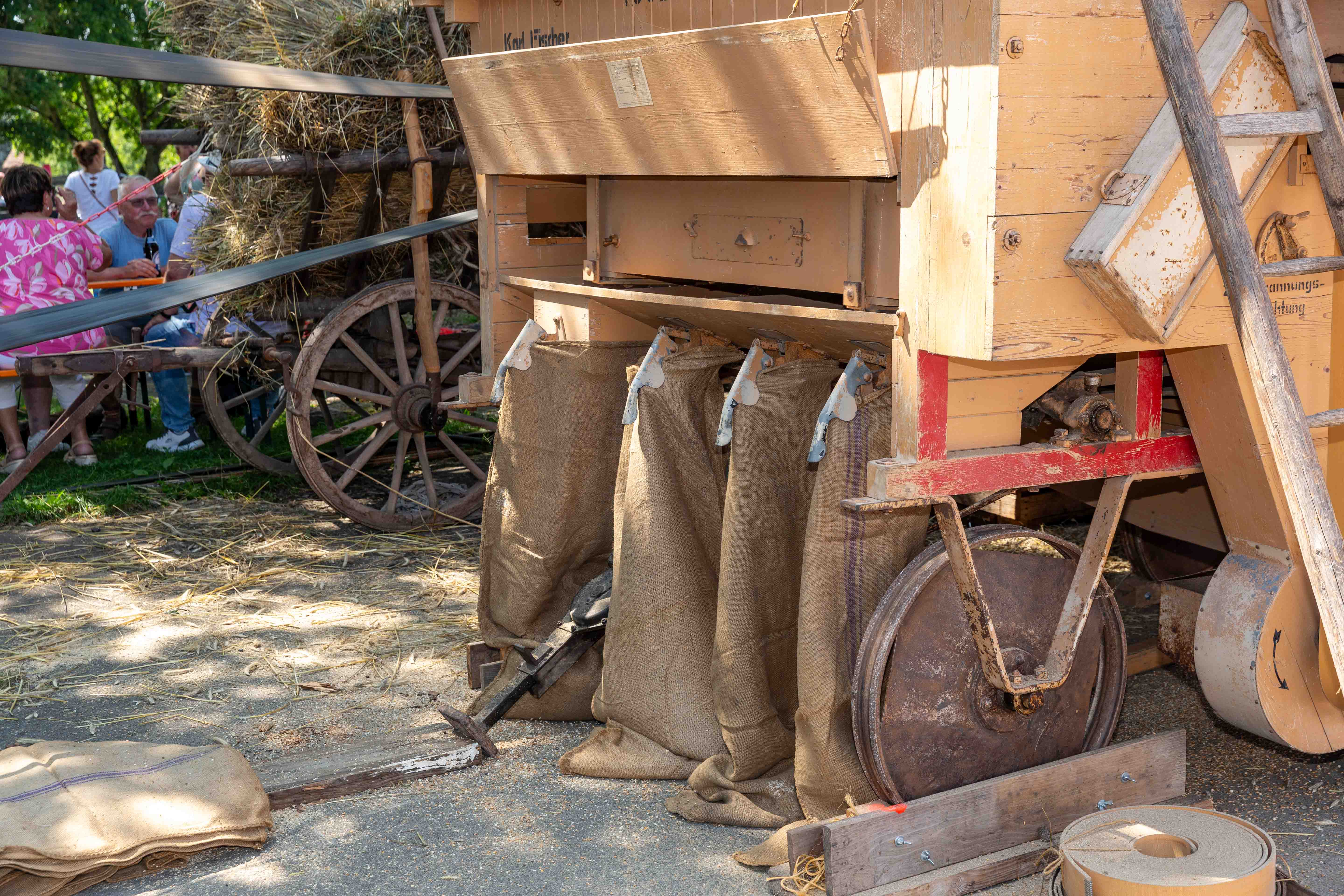 Demonstration traditioneller Erntetechnik: z. B. Mähbinder, Garbenbinden, historische Seilmaschinen.